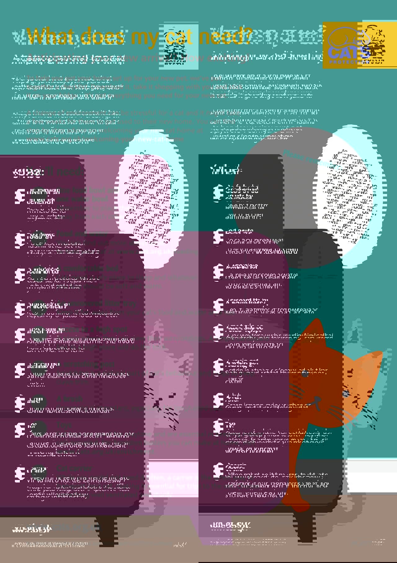 - Food and water. Wondering what to feed your cat? You can find out more about their nutritional needs here: Feeding cats